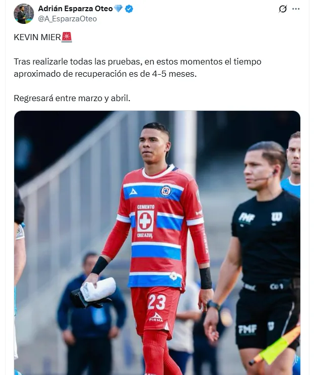 Según información revelada por Adrián Esparza Oteo de TUDN, se reveló cuánto tiempo estima Cruz Azul que estará fuera Kevin Mier de las canchas. Y de acuerdo con el comunicador, le tomará entre 4 a 5 meses al colombiano para volver a jugar con La Máquina.
