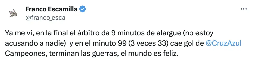 “Ya me vi, en la final el árbitro da 9 minutos de alargue (no estoy acusando a nadie) y en el minuto 99 (3 veces 33) cae gol de Cruz Azul Campeones, terminan las guerras, el mundo es feliz”