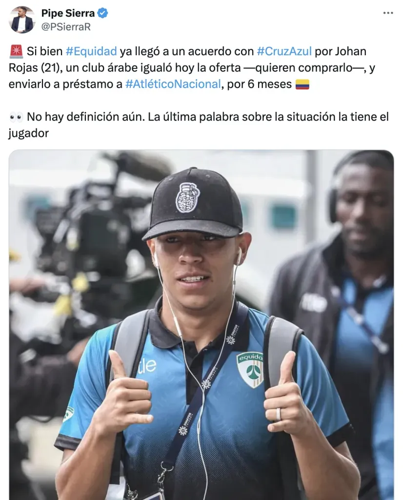 “Si bien Equidad llegó a un acuerdo con Cruz Azul por Johan Rojas, un club árabe hoy igualó la oferta y quieren comprarlo y enviarlo a préstamo al Atlético Nacional por 6 meses. No hay decisión aún, la última palabra sobre la situación la tiene el jugador”
