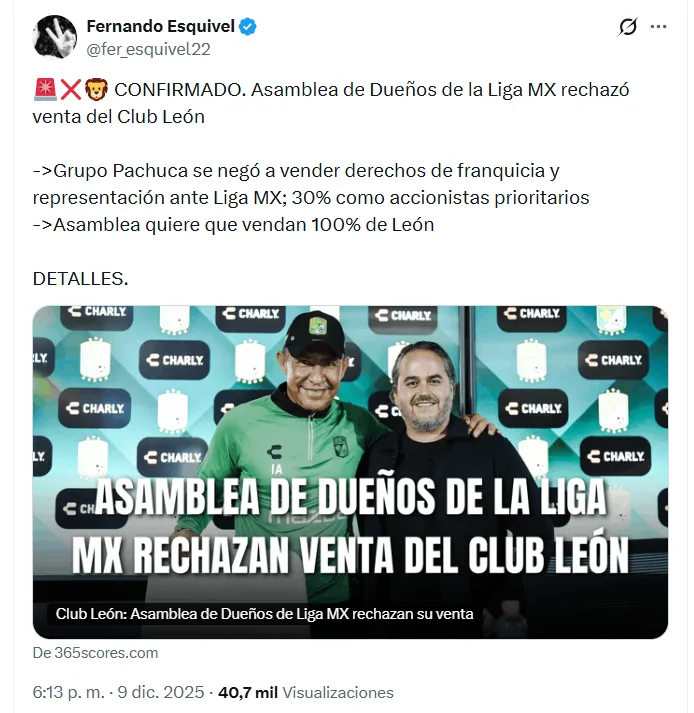 Con información de los amigos de 365scores se dio a conocer que fue durante la reunión de Dueños donde el conjunto de León presentó una propuesta para su venta. La cual no le dieron permiso de venderse bajo la oferta que habría puesto sobre la mesa la directiva de los Esmeraldas.