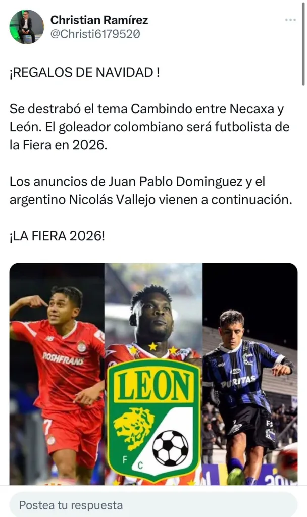 Además de eso, Díber Cambindo no llegaría solo a León. Pues de acuerdo con Christian Ramírez, el goleador estaría acompañado por Juan Pablo Domínguez y Nicolás Vallejo como refuerzos para el siguiente torneo.