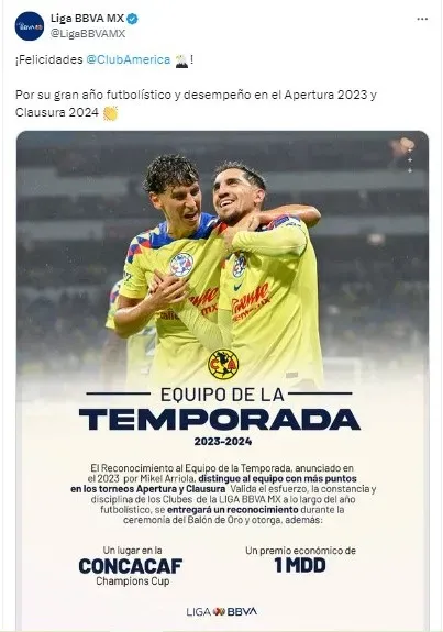 Resulta que esta distinción se la llevaron los azulcremas por ser el club que más puntos sumó en el año futbolístico. Lo que comprende entre el torneo Apertura 2023 y en el Clausura 2024. Reconocimiento que se les entregará en la próxima ceremonia del Balón de Oro que se celebrará este próximo verano.