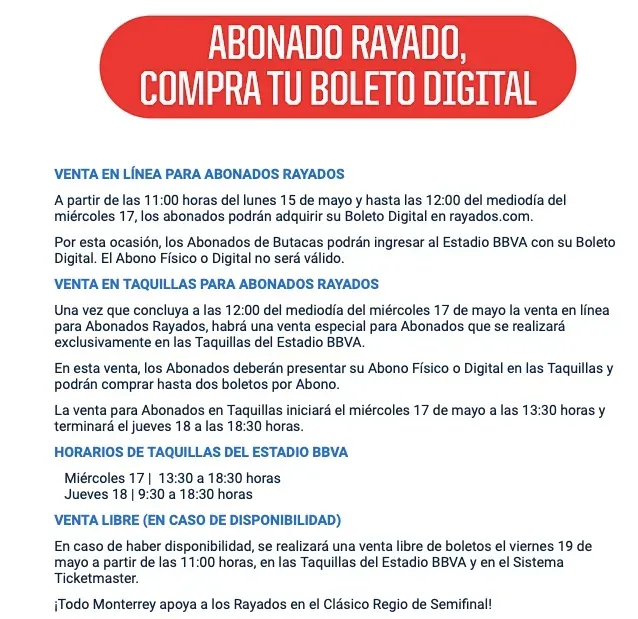 Para el partido de Vuelta en el Estadio BBVA, también habrá una preventa para abonados de manera digital. Esta iniciaría el lunes, 15 de mayo a través de la página oficial de Rayados y taquillas del Estadio BBVA. Este beneficio durará hasta el miércoles 17.