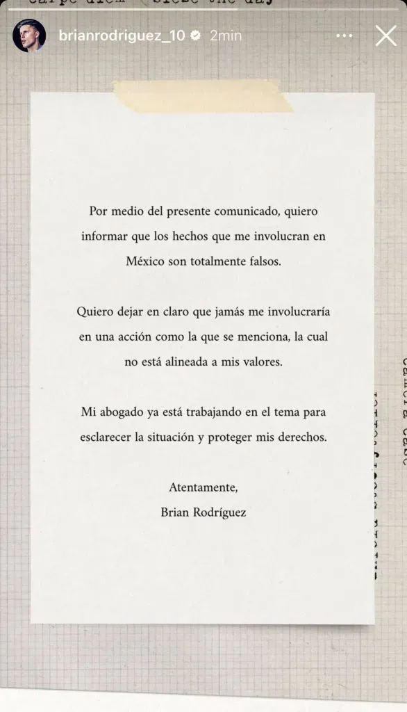 “Por medio del presente, quiero informar que los hechos que me involucran en México son totalmente falsos. Quiero deja en claro que jamás me involucraría en una acción como la que se menciona, la cual no está alineada a mis valores. Mi abogado ya está trabajando en el tema para esclarecer la situación y proteger mis derechos”