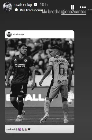 Esa misma publicación la compartió en sus stories, donde puso la frase “Ma brotha“, escribió Salcedo. Esto junto a una imagen en donde se le ve con el propio Dos Santos en el último duelo que disputaron los celestes ante los americanistas, que fue un amistoso en Estados Unidos.