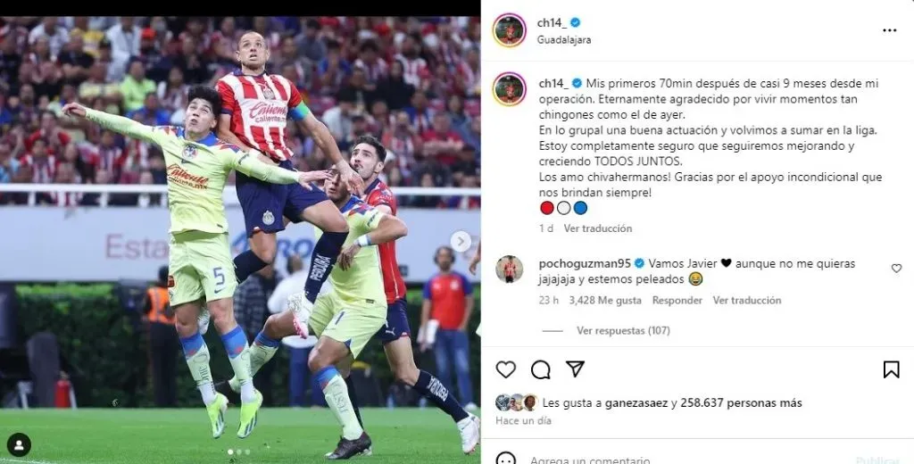 “Mis primeros 70min después de casi 9 meses desde mi operación. Eternamente agradecido por vivir momentos tan chingones como el de ayer. En lo grupal una buena actuación y volvimos a sumar en la liga. Estoy completamente seguro de que seguiremos mejorando y creciendo TODOS JUNTOS. Los amo chivahermanos! ¡Gracias por el apoyo incondicional que nos brindan siempre!”