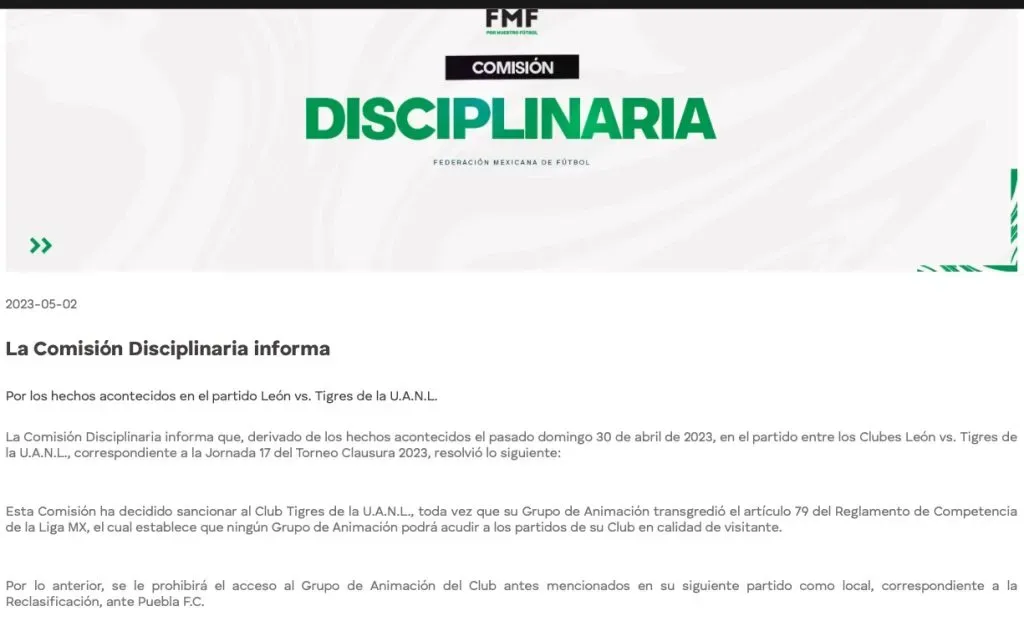 Otros grupos de animación ya habían sido castigados con anterioridad en este mismo Torneo Clausura 2023. La Comisión Disciplinaria fue quien emitió el comunicado esta tarde en plena fecha de venta de boletos para el partido.