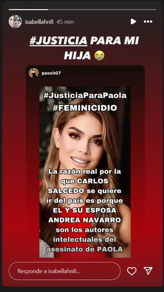“La razón real por la que Carlos Salcedo se quiere ir del país, es porque él y su esposa Andrea Navarro son los autores intelectuales del asesinato de Paola”