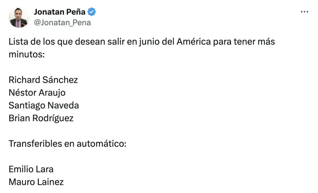 Fue por medio de redes sociales que el insider de las Águilas, Jonathan Peña, dio a conocer que cuatro figuras del combinado americanista le pidieron a la directiva dejarlos ir en el verano. Se trata nada más ni nada menos que de Richard Sánchez, Néstor Araujo, Santiago Naveda y Brian Rodríguez.