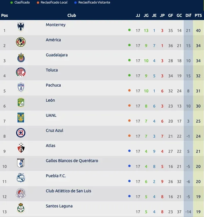 Por lógica de formato, Monterrey puede saber que Cruz Azul, Atlas, Puebla, San Luis y Santos puede ser sus rivales. Como líder se enfrenta a quien esté más abajo en la tabla, evitando así al quinto, sexto y séptimo lugar.