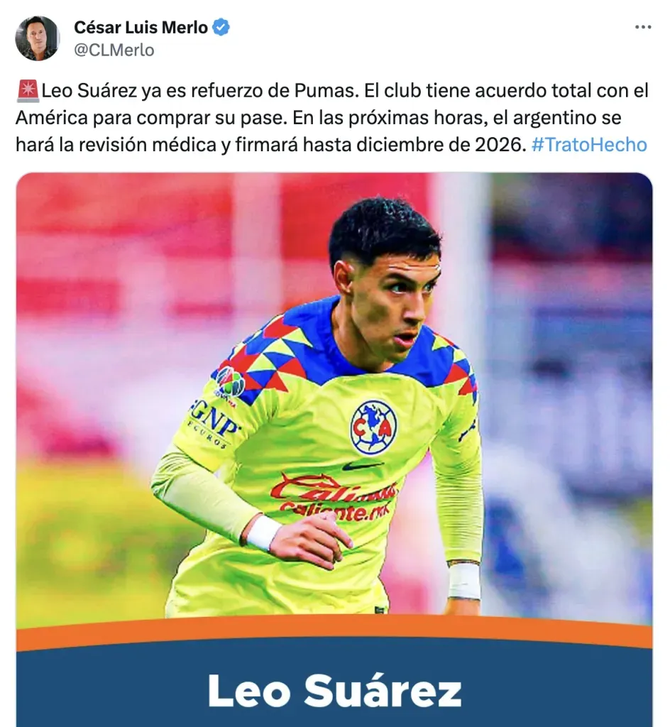 De acuerdo con la información del periodista César Luis Merlo, el equipo auriazul logró llegar a un acuerdo con las Águilas del América, para cerrar el fichaje del futbolista de 27 años de edad.