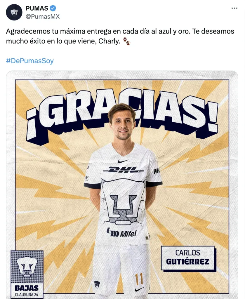 Durante las últimas horas, el equipo del Pedregal confirmó una nueva baja para el próximo certamen futbolístico, pues se trata de Carlos Gutiérrez, quien también ya se despidió del equipo universitario, agradeciéndole la oportunidad que le dieron durante todos estos años.