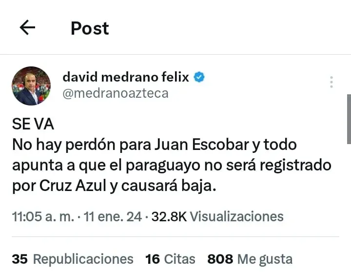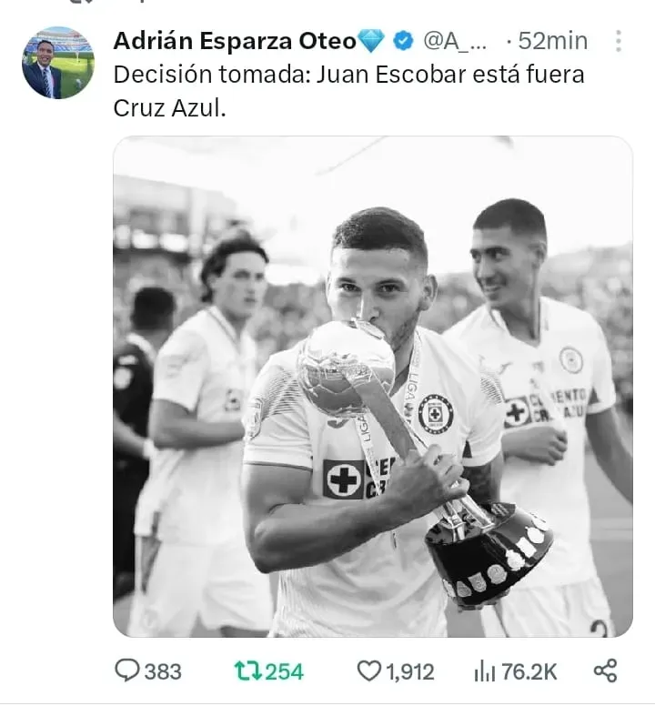 Ante esto, diversos comunicadores como David Medrano y Adrián Esparza confirmaron lo que los fans celestes temían. Es un HECHO LA SALIDA de Juan Escobar.