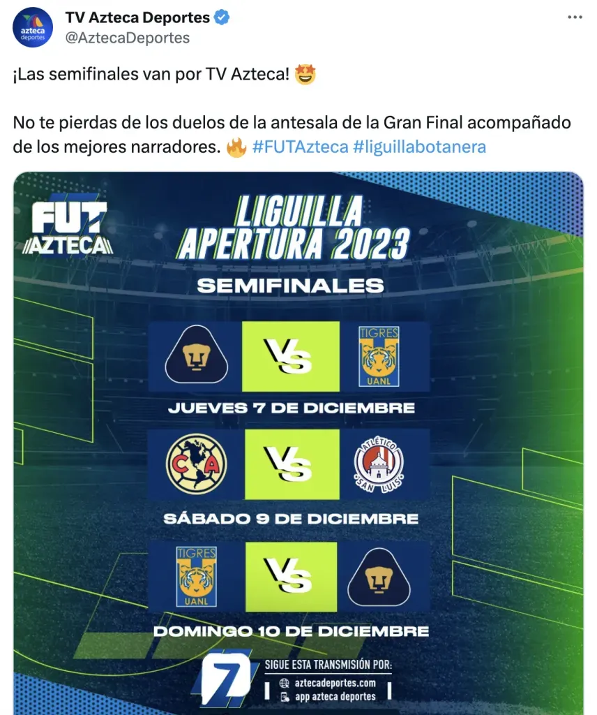 La televisora del Ajusco anunció oficialmente que de los cuatro partidos de semifinales (ida y vuelta) tendrá tres de ellos, siendo la ida del San Luis y América el único que no tendrán, ya que irá por exclusiva por ESPN y Star+.