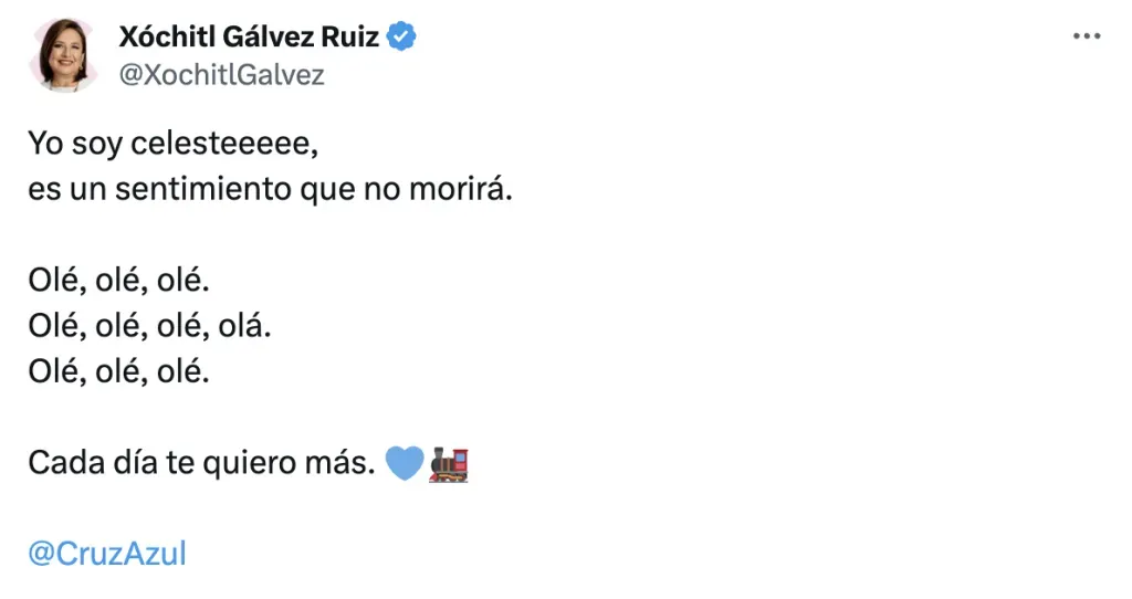 La candidata ha mostrado en repetidas ocasiones su pasión por la Máquina; incluso, ha acudido al Estadio Ciudad de los Deportes a alentar a su equipo, por lo que no dudó en festejar en redes sociales la victoria que obtuvieron ante el cuadro del Pedregal.