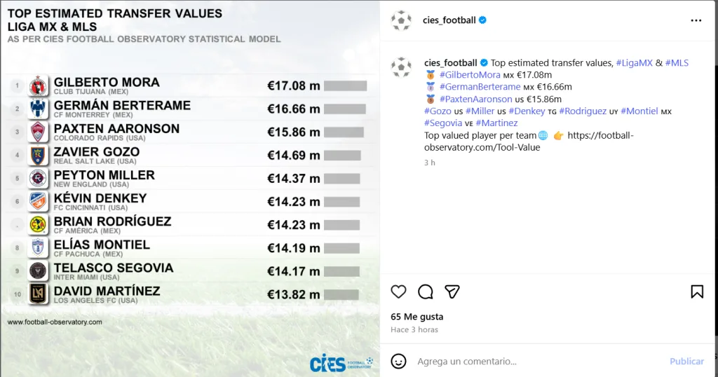 De acuerdo con información del Centro Internacional de Estudios del Deporte (CIES), conocido como el Observatorio de Futbol. Estos dieron a conocer un listado donde se reveló al jugador más valioso para una transferencia de la Liga MX, y donde Gilberto Mora la encabeza. Como también destaca Lamine Yamal del Barcelona, pero en otra categoría.