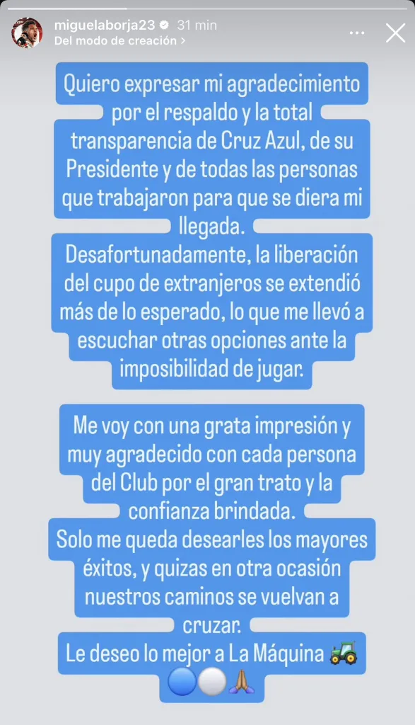 Fue mediante sus redes sociales que Miguel Ángel Borja confesó lo que realmente sucedió, agradeciendo el interés y manejo de la directiva celeste, indicando que la razón por la que no se cerró su fichaje, fue precisamente por la plaza de extranjero.