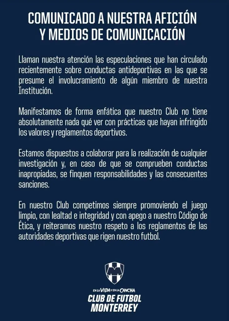 Los Rayados finalizaron su comunicado reiterando su compromiso y “promoviendo el juego limpio, con lealtad e integridad y con apego a nuestro Código de Ética, y reiteramos nuestro respeto a los reglamentos de las autoridades deportivas que rigen nuestro futbol”.