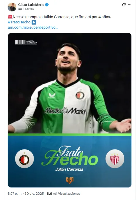 - Feyenoord llegó a un acuerdo con Necaxa por la carta de Julián Carranza, ya que estaba de préstamo en tierras inglesas.