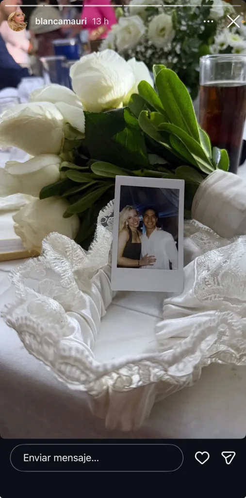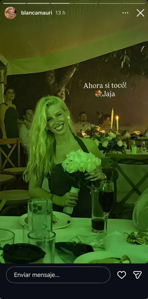 Blanca Mauri subió varias imágenes del enlace matrimonial. Pero destacó una en la que ella aparece sentada en una mesa y posando con un ramo de novia. Además, acompañó la foto con la frase: “¡Ahora sí tocó! Jaja”.