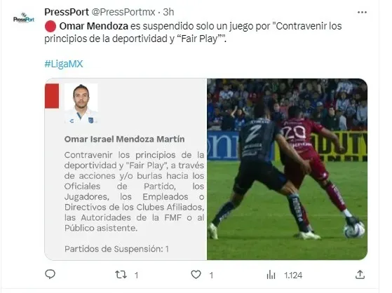 Tras esto, la Comisión Disciplinaria anunció la sanción para elemento queretano, quien se perderá solo un partido del torneo.