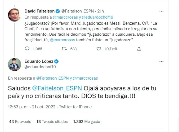 Todo comenzó luego de una publicación de Marc Corsas, quien destacó el buen nivel que viene mostrando Chofis a diferencia de lo que fue su paso en Chivas.