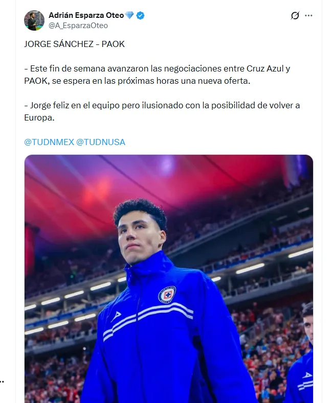 Según información de Adrián Esparza y Gerardo González, se dio a conocer que después de que se revelara que el PAOK de Europa estaba interesado en los servicios de Jorge Sánchez. Se reveló que el equipo griego ya aumentó la oferta que habría hecho por el tricolor.