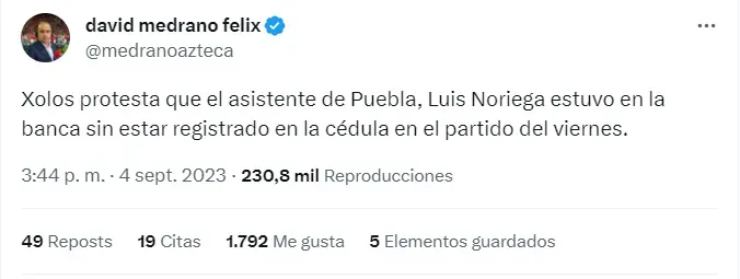 Fue lo que relató Medrano en sus redes sociales. Por lo que el partido en cuestión no tuvo más que disputarse el pasado 1 de septiembre de 2023.