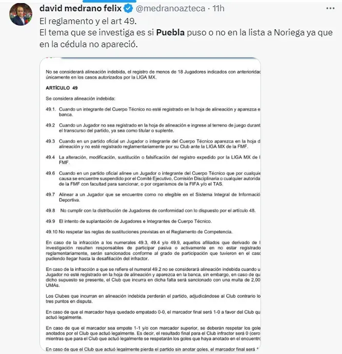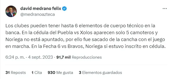“Los clubes pueden tener hasta 6 elementos de cuerpo técnico en la banca. En la cédula del Puebla vs Xolos aparecen solo 5 camoteros y Noriega no está apuntado, por ello fue sacado de la cancha con el juego en marcha. En la Fecha 6 vs Bravos, Noriega sí estuvo inscrito en cédula”