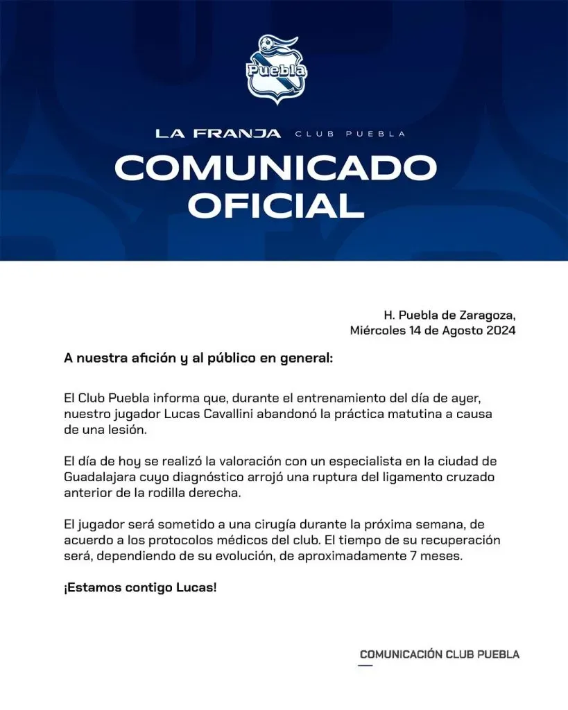 El equipo poblano informó que el atacante canadiense de 31 años de edad, se someterá a una operación la próxima semana, y el tiempo de recuperación será de aproximadamente 7 meses; es decir, volvería para marzo de 2025, que significaría a mediados del torneo Clausura de Liga MX.