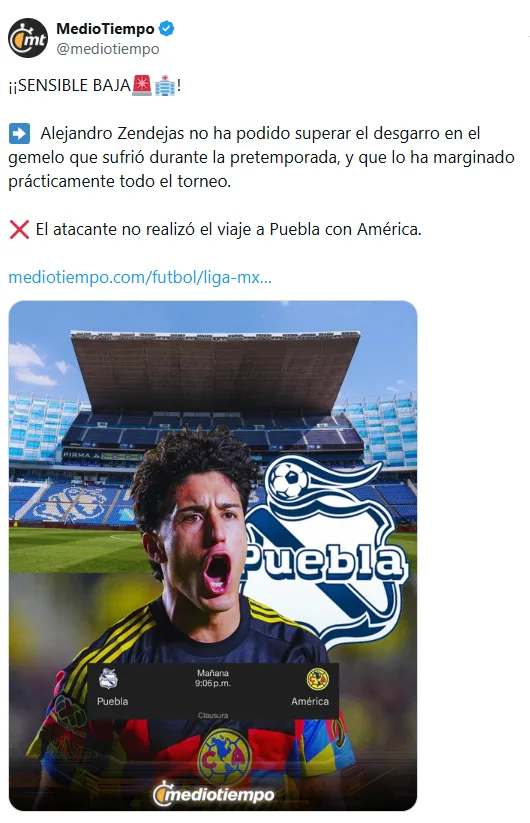 - Alejandro Zendejas no jugará el Puebla vs América por un desgarre en el aductor derecho sufrido ante Monterrey.