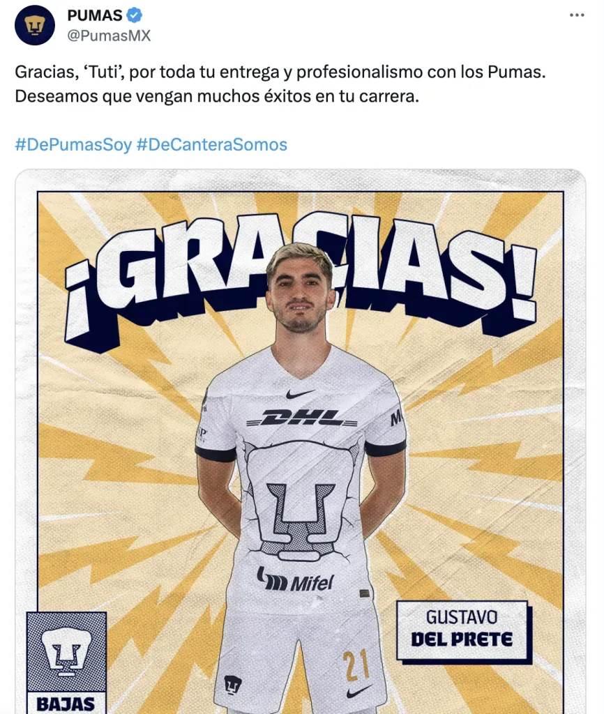 “Gracias, ‘Tuti’, por toda tu entrega y profesionalismo con los Pumas. Deseamos que vengan muchos éxitos en tu carrera”