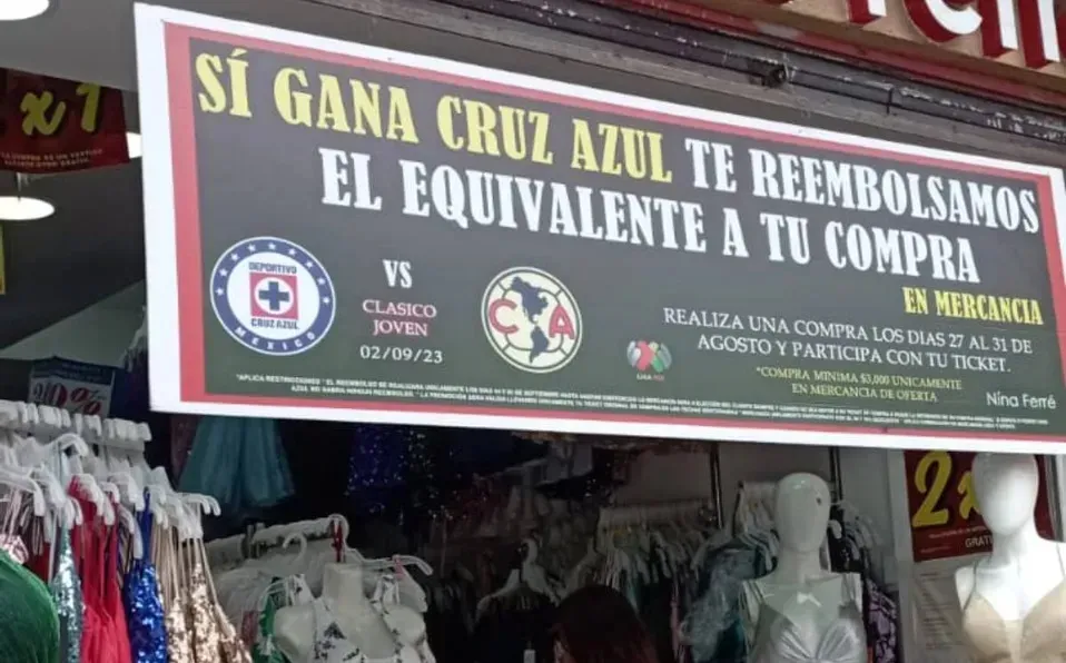 “Si gana Cruz Azul te reembolsamos el equivalente a tu compra en mercancías” se lee imponente el cartel por fuera del comercio y en letras más pequeñas se especifican los detalles de la promoción. Solo valen las compras hechas entre el 27 y el 31 de agosto y la copra debe ser igual o superior a los 3 mil pesos