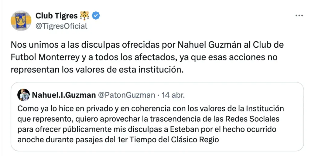 El equipo regiomontano se manifestó en redes sociales, luego de las disculpas públicas que ofreció su portero. “Nos unimos a las disculpas ofrecidas por Nahuel Guzmán al Club de Futbol Monterrey y a todos los afectados, ya que esas acciones no representan los valores de esta institución”.