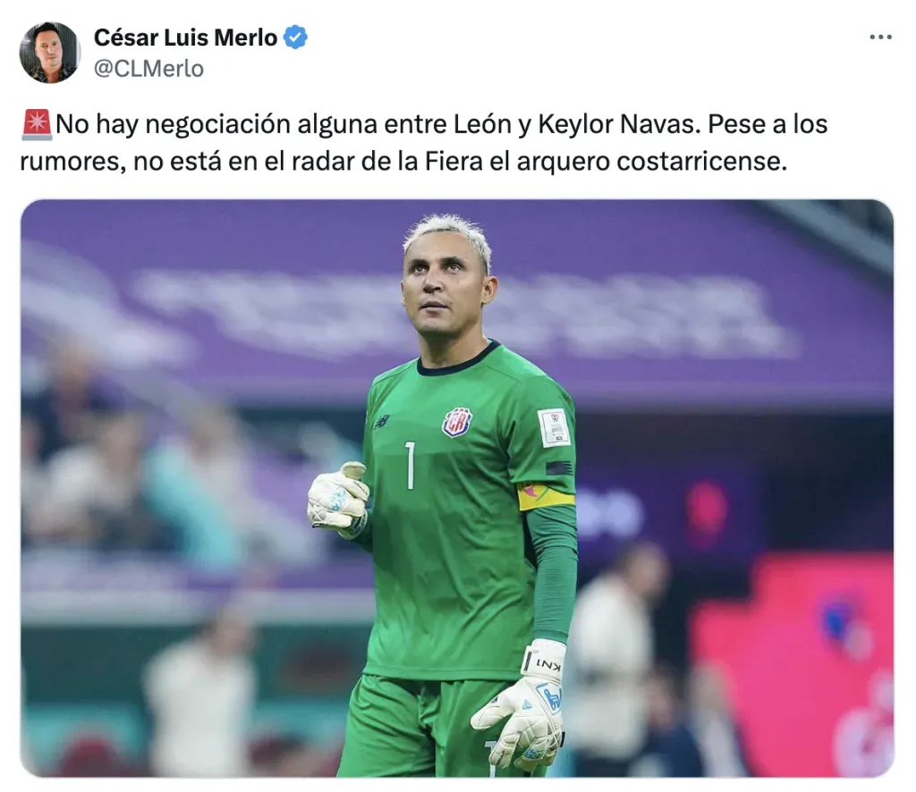 “No hay negociación alguna entre León y Keylor Navas. Pese a los rumores, no está en el radar de la Fiera el arquero costarricense”