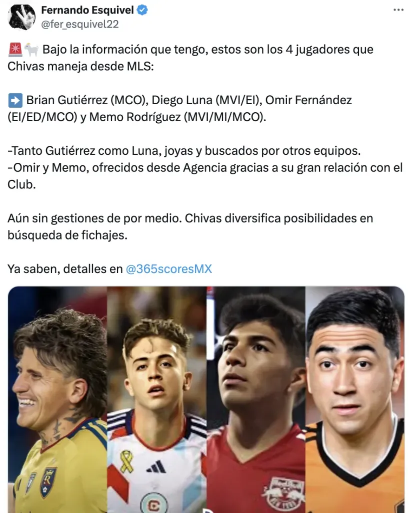 De acuerdo con la información de Fernando Esquivel, el cuadro rojiblanco tendría en la mira a cuatro jugadores, todos ellos militan en la actualidad en la MLS: Brian Gutiérrez, Diego Luna, Omir Fernández y Memo Rodríguez.