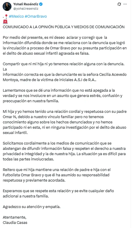 Su madre, identificada como Cecilia Acevedo Montoya, progenitora de la víctima identificada con las iniciales A.S.I de R.A. De acuerdo con información que dio a conocer Claudia Casas, expareja de Omar Bravo en charla a RadioFórmula, fue la que respaldó la denuncia contra Bravo.