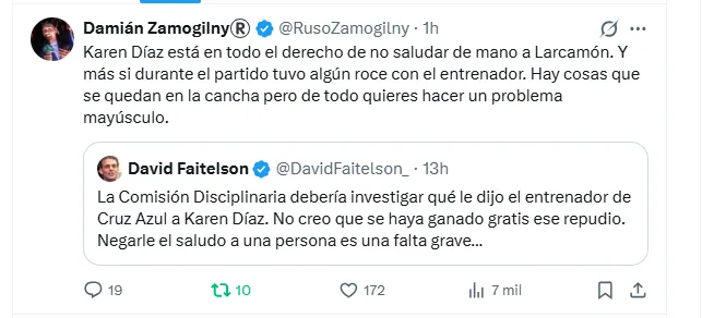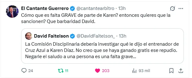 Pese a ello, otros personajes como David Faitelson han buscado cuestionar su reacción ante el supuesto saludo de Nicolás Larcamón, y han exigido claridad a la Comisión Disciplinaria. Lo que ha provocado que muchos le respondan como exárbitros, en defensa de lo que le sucedió a Karen ante la prepotencia de Larcamón.