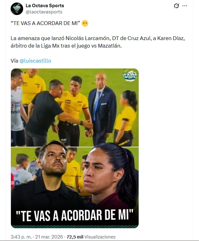 Fue el polémico comentarista, Luis Castillo quien por medio de un video en redes sociales aseguró que el estratega, Nicolás Larcamón AMENAZÓ a la silbante Karen Díaz. Lo que ocasionó que la árbitra se hiciera para atrás y esta decidiera no tener más contacto con el sudamericano.