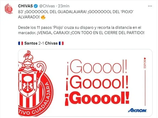 Se acabó el invicto del Chivas en el campeonato mexicano, luego de caer por un marcador 2-1 en su visita a Santos Laguna.