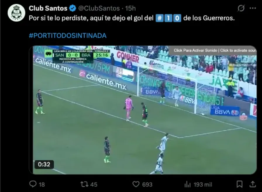 Santos Laguna ha utilizado su cuenta oficial de X para publicar un video del gol marcado por Ezequiel Bullaude. Lo llamativo, es que el CM ha publicado el tanto, siguiendo el partido a través de una página pirata.
