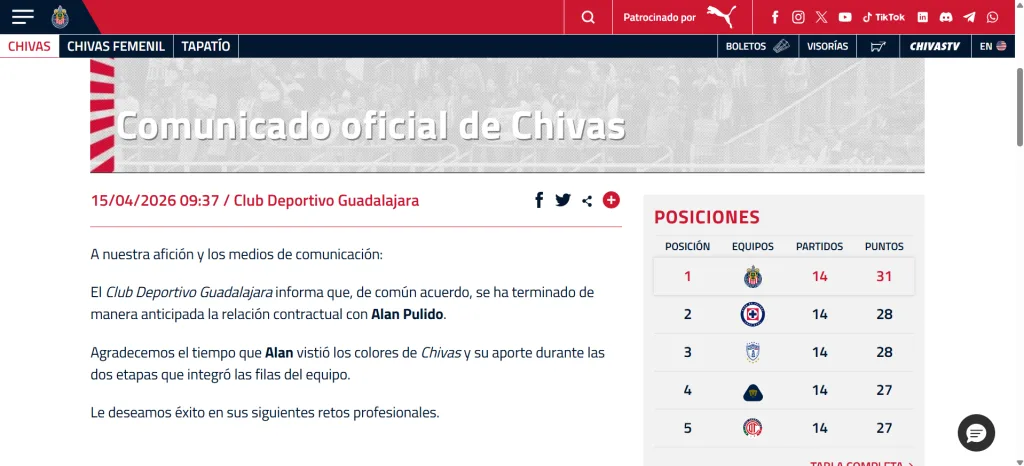 “El Club Deportivo Guadalajara informa que, de común acuerdo, se ha terminado de manera anticipada la relación contractual con Alan Pulido. Agradecemos el tiempo que Alan vistió los colores de Chivas y su aporte durante las dos etapas que integró las filas del equipo”.