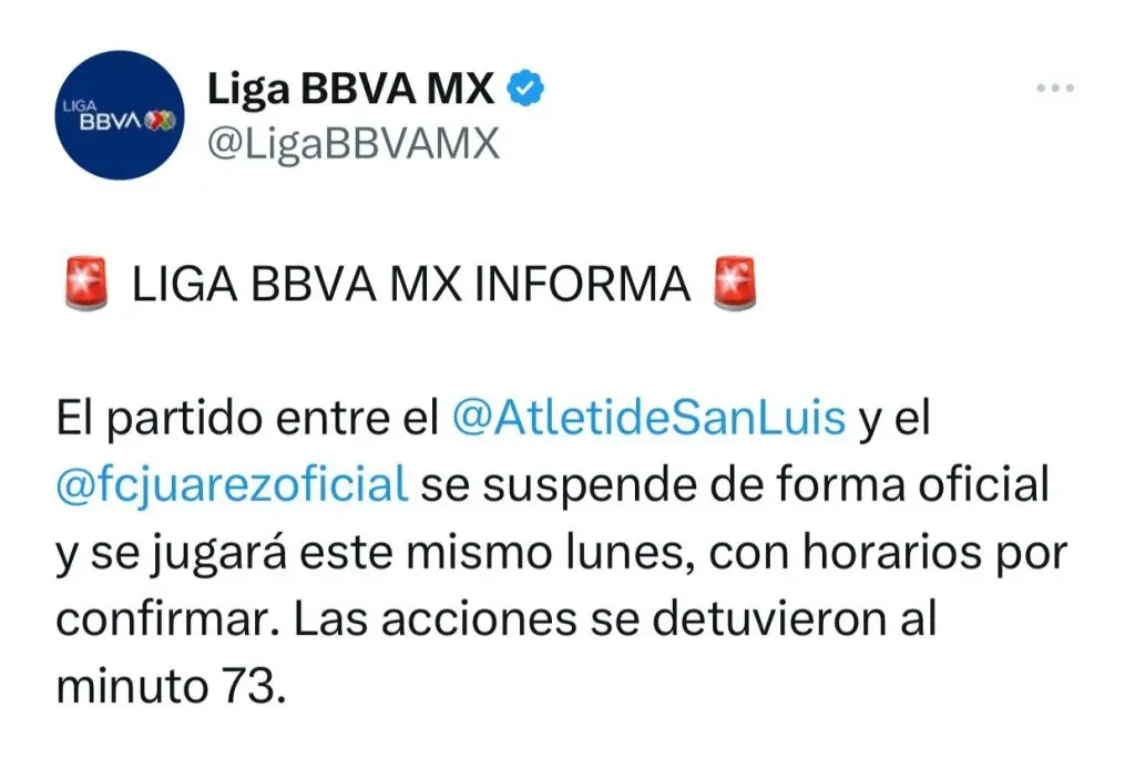 Es por esta razón que las autoridades del futbol de nuestro país, determinaron suspender el encuentro en tierras potosinas. Por lo que los 27 minutos restantes se disputarán este lunes 8 de abril para determinar al ganador de los tres puntos y su lugar en la Tabla General.