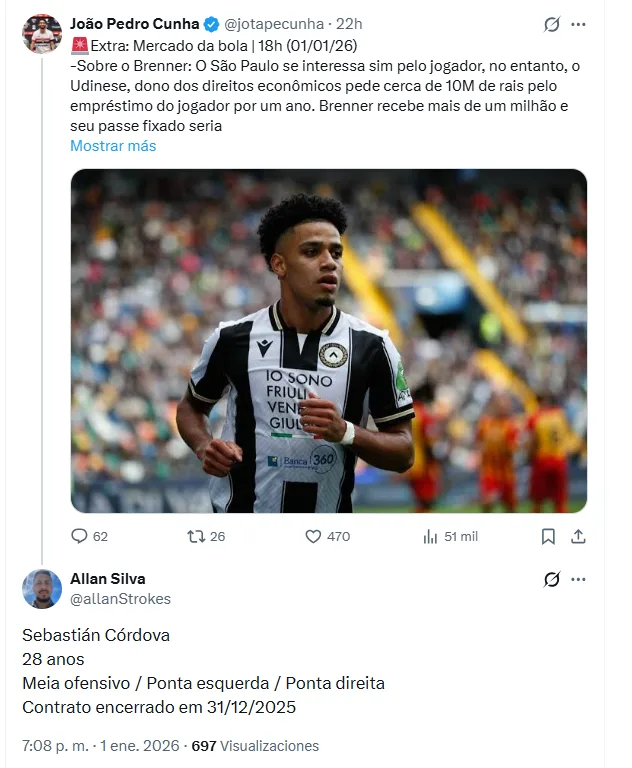 Fue el periodista brasileño y especialista en transferencias, Joao Pedro Cunha, quien habló sobre la posible llegada de Brenner al conjunto del Sao Paulo. Y en medio de los detalles sobre este fichaje que llegaría directo del Udinese, el nombre del mexicano Sebastián Córdova salió a la luz.