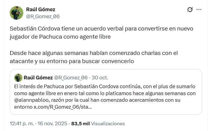 El comunicador señaló que estos acercamientos con Sebastián Córdova han comenzado este 2025, y no han dejado de mantenerse en contacto. Pero al parecer, para el Clausura 2026 la directiva de los Tuzos va enserio y ya habría logrado avanzar con un acuerdo con el futbolista mexicano.
