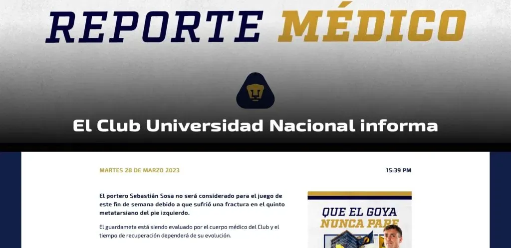 Sebastián Sosa presenta con los Pumas una fractura en el quinto metatarsiano del pie izquierdo. Su tiempo de recuperación está en duda, pero esto podría significar que se pierde el resto del torneo, aunque deberá esperar su evolución y el dictamen final de los médicos.