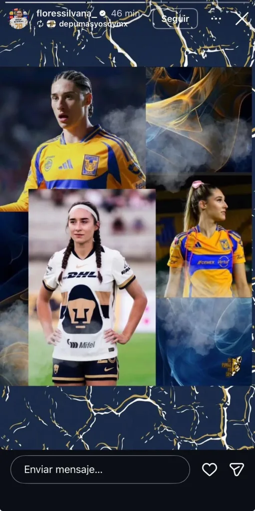 En sus historias de Instagram, la mediocampista de 23 años reposteó una publicación en la que aparecen Silvana, Marcelo Flores y Tatiana Flores. La primera, con la camiseta de la UNAM, y los dos últimos con la de Tigres.