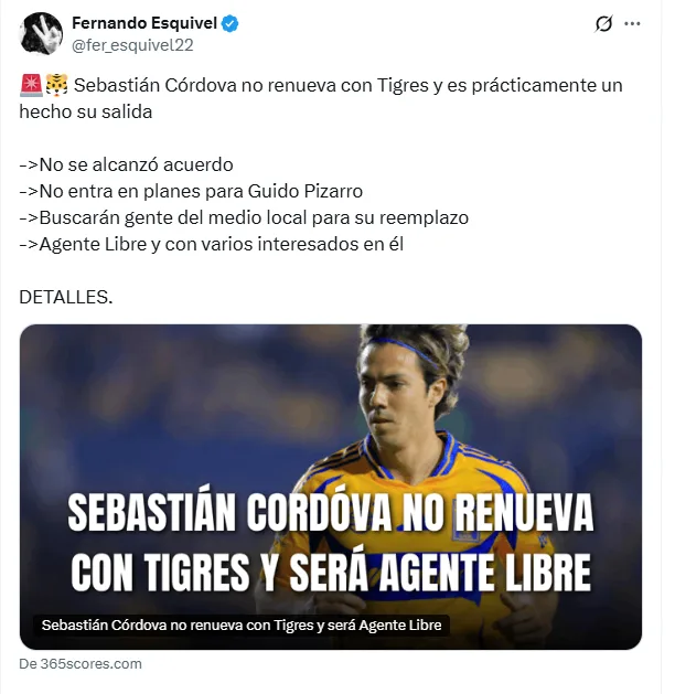 En medio de los rumores sobre un posible acuerdo con los Tuzos de Pachuca para el Clausura 2026. Los amigos de 360scores dieron a conocer que Tigres ya habría tomado una decisión sobre Sebastián Córdova. A quien no piensan renovarle su contrato y dejarlo como agente libre para el próximo año.