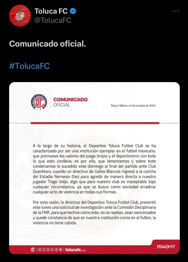 “La agresión hacia nuestro portero Tiago Volpi, es inaceptable bajo cualquier circunstancia. Por esta razón, la directiva del Deportivo Toluca Futbol Club, presentó una solicitud de investigación ante la Comisión Disciplinaria de la FMF”.