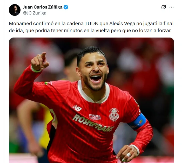 Fue el propio Turco Mohamed quien reveló a los amigos de TUDN que Toluca tiene la ligera esperanza de que Alexis Vega vea minutos en la Vuelta de la Gran Final ante Tigres UANL. Por lo que no estaría descartado el futbolista de la Selección Mexicana para este duelo donde podrían coronarse Bicampeones.